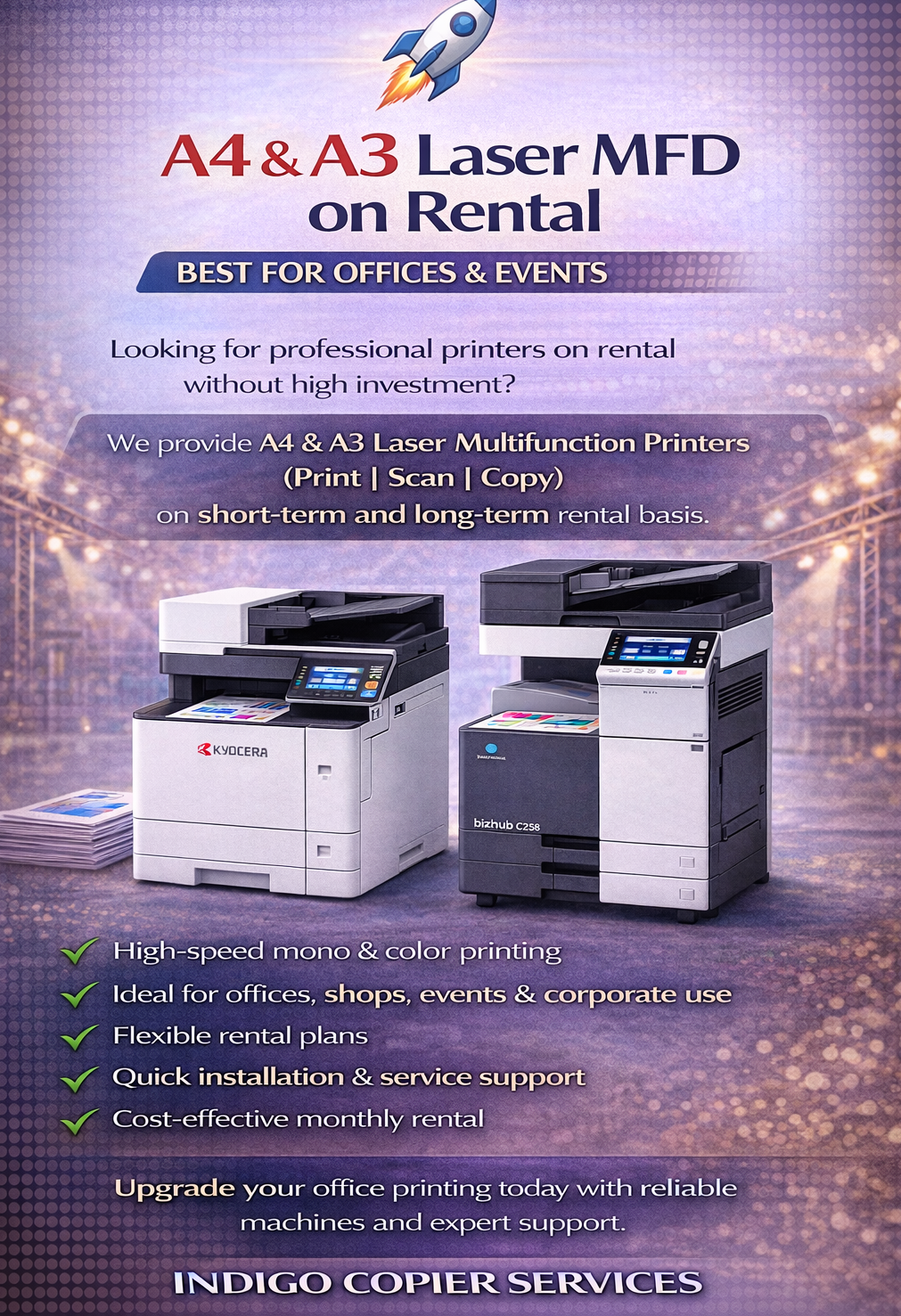 A4 & A3 Laser MFD on Rent – Best for Offices & Events Looking for professional printers on rental without a high investment? We provide A4 & A3 Laser Multifunction Printers (Print | Scan | Copy) on a short-term and long-term rental basis. * High-speed mono & color printing * Ideal for offices, shops, events & corporate use * Flexible rental plans * Quick installation & service support * Cost-effective monthly rental Upgrade your office printing today with reliable machines and expert support. Indigo Copier Services