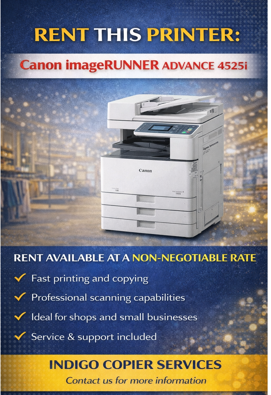 The Canon imageRUNNER ADVANCE 4525i is available on rental at a fixed, non-negotiable rate. Designed for productivity, this multifunction printer provides fast output, reliable scanning, and hassle-free operation, making it suitable for offices and retail environments.