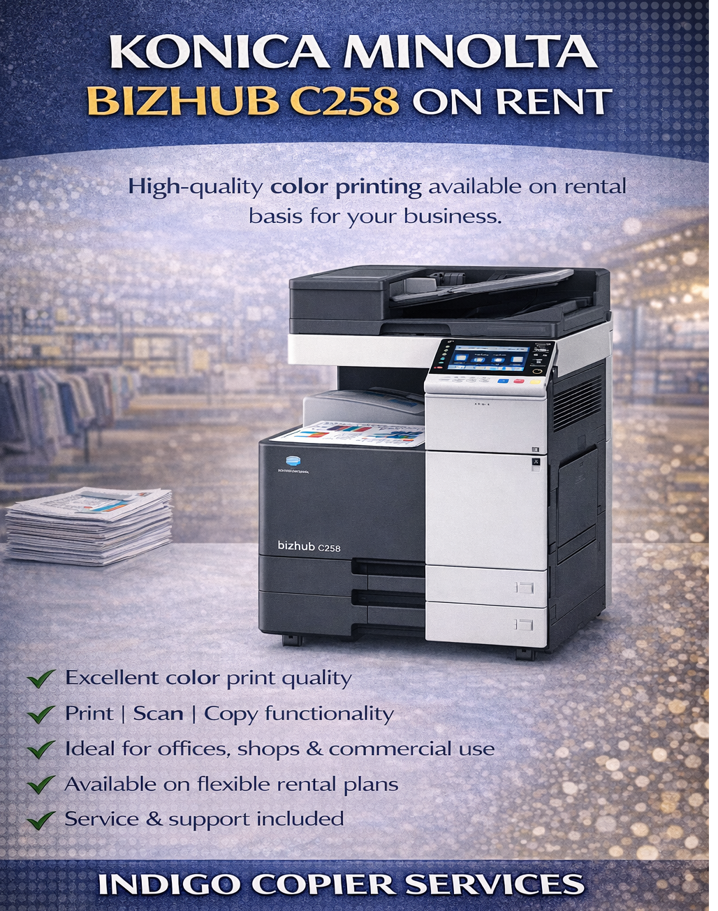 A reliable and high-quality color multifunction printer designed to meet everyday business printing needs. * Excellent color print quality * Print | Scan | Copy functionality * Ideal for offices, shops & commercial use * Available on flexible rental plans * Service & support included A smart rental solution for businesses looking for performance, quality, and cost efficiency. Indigo Copier Services