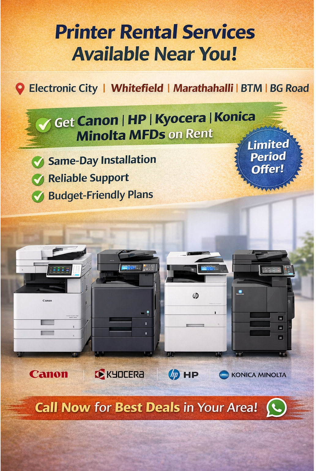 Printer Rental Services Available Near YouPrinter Rental Services Available Near You Serving areas like: Electronic City | Whitefield | Marathahalli | BTM | BG Road Get Canon | HP | Kyocera | Konica Minolta MFDs on rent ✔ Same-day installation ✔ Reliable support ✔ Budget-friendly plans Contact today for the best deals! Indigo Copier Services