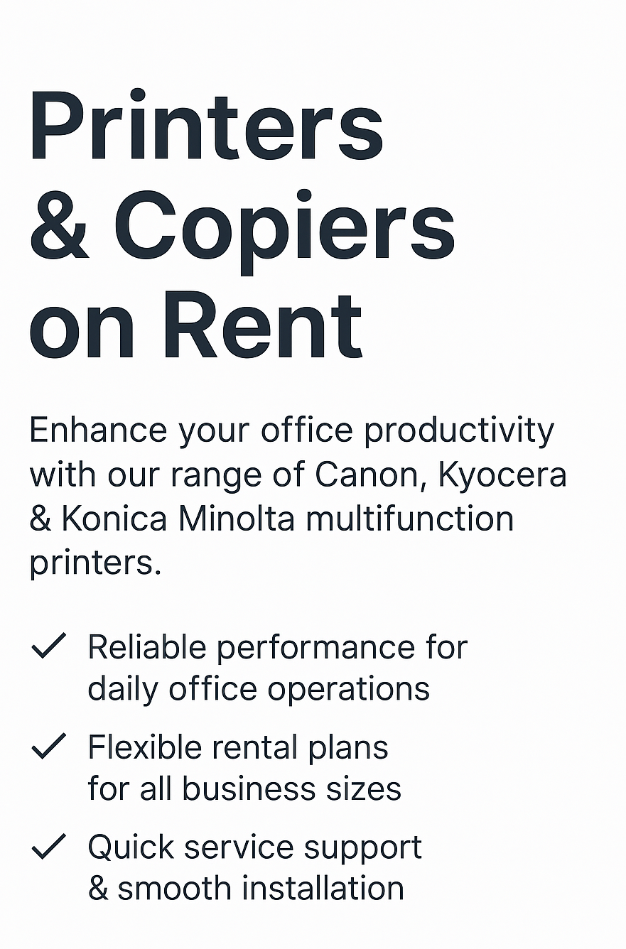 Today’s Update – Printers & Copiers on Rent Enhance your office productivity with our range of Canon, Kyocera & Konica Minolta multifunction printers. Designed for seamless printing, scanning, and copying, our rental solutions help your business stay efficient and cost-effective. Reliable performance for daily office operations Flexible rental plans for all business sizes Quick service support & smooth installation