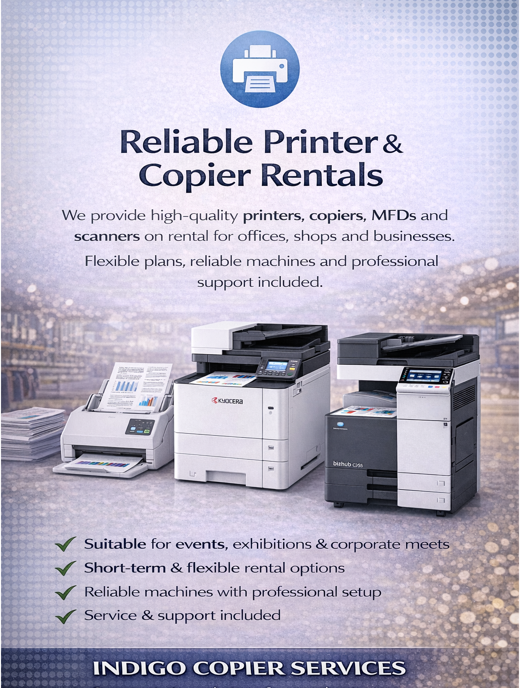 We provide high-quality printers, copiers, MFDs and scanners on rental for offices, shops and businesses. Flexible plans, reliable machines and professional support included. Indigo Copier Services